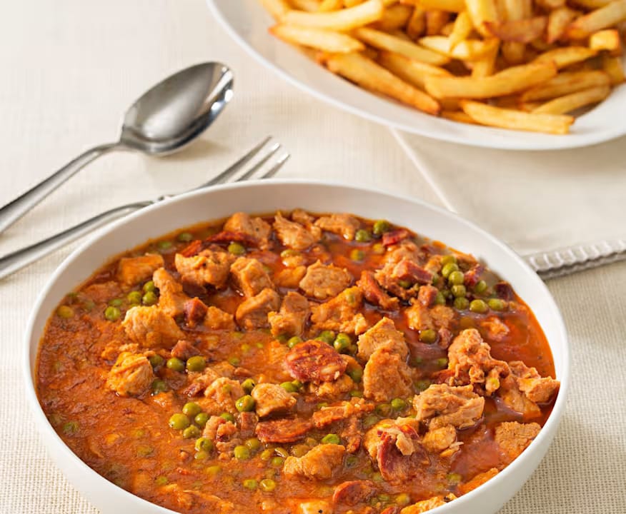 Carcamusas. Toledo's most typical dish. Pork with tomato, peas, bay leaf and white wine. It is served steaming hot in a clay pot. You'll need to order plenty of bread with this meal!